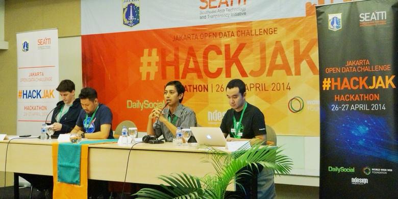 Kepala UPT PIPP Badan Perencanaan Pembangunan Daerah Provinsi DKI Jakarta, Setiaji (kedua dari kanan) ketika memberikan keterangan seputar kompetisi pada peserta #HACKJAK, bersama perwakilan dari DailySocial dan SEATTI di Jakarta, Sabtu (26/4/2014).